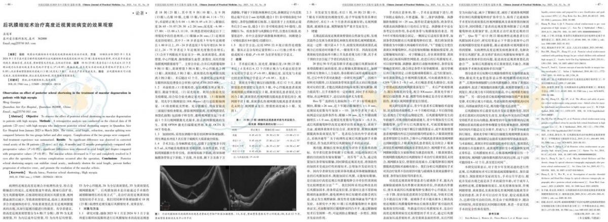 近期,泉州爱尔眼科医院眼底病科孟冠军博士撰写的研究论文《后巩膜缩短术治疗高度近视黄斑病变的效果观察》,正式发表于中华医学会主办的国家级学术期刊《中国实用医刊》(2025年9月第52卷第18期)。这一学术成果的落地,不仅彰显了孟冠军博士在眼底病诊疗领域的深厚造诣,更是泉州爱尔眼科医院注重科研能力和学科建设、人才梯队培养的体现。